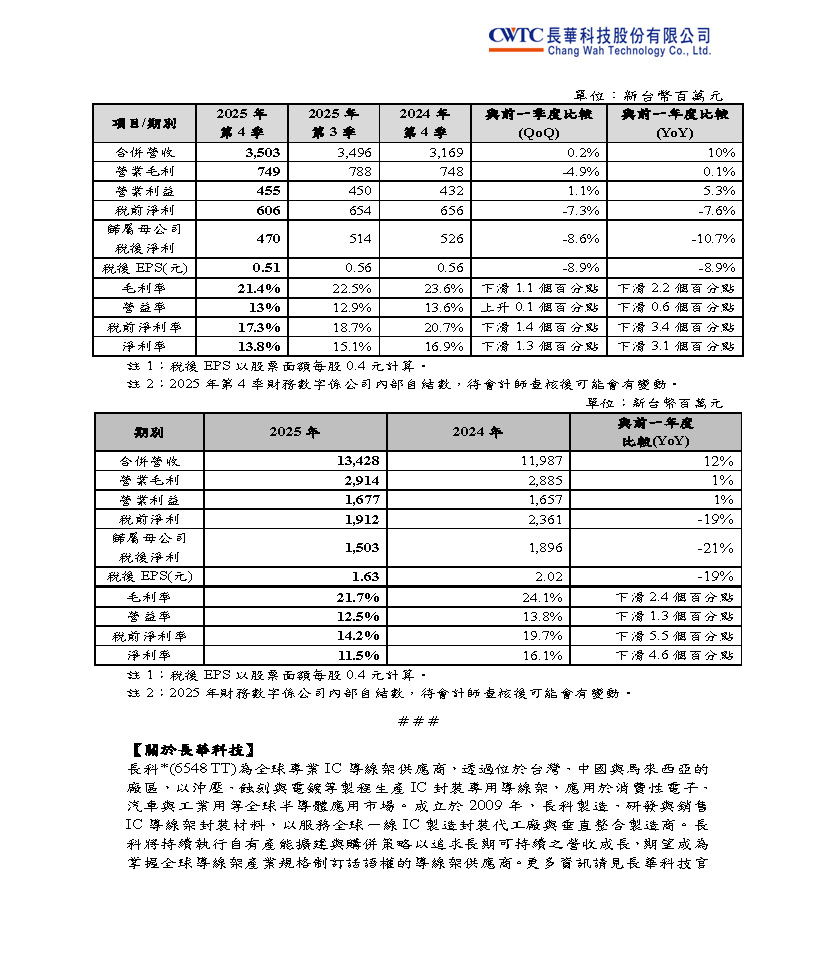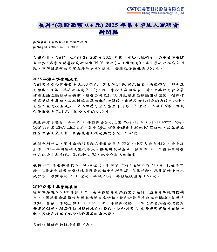 長華科技(6548)2025年第4季法人說明會新聞稿