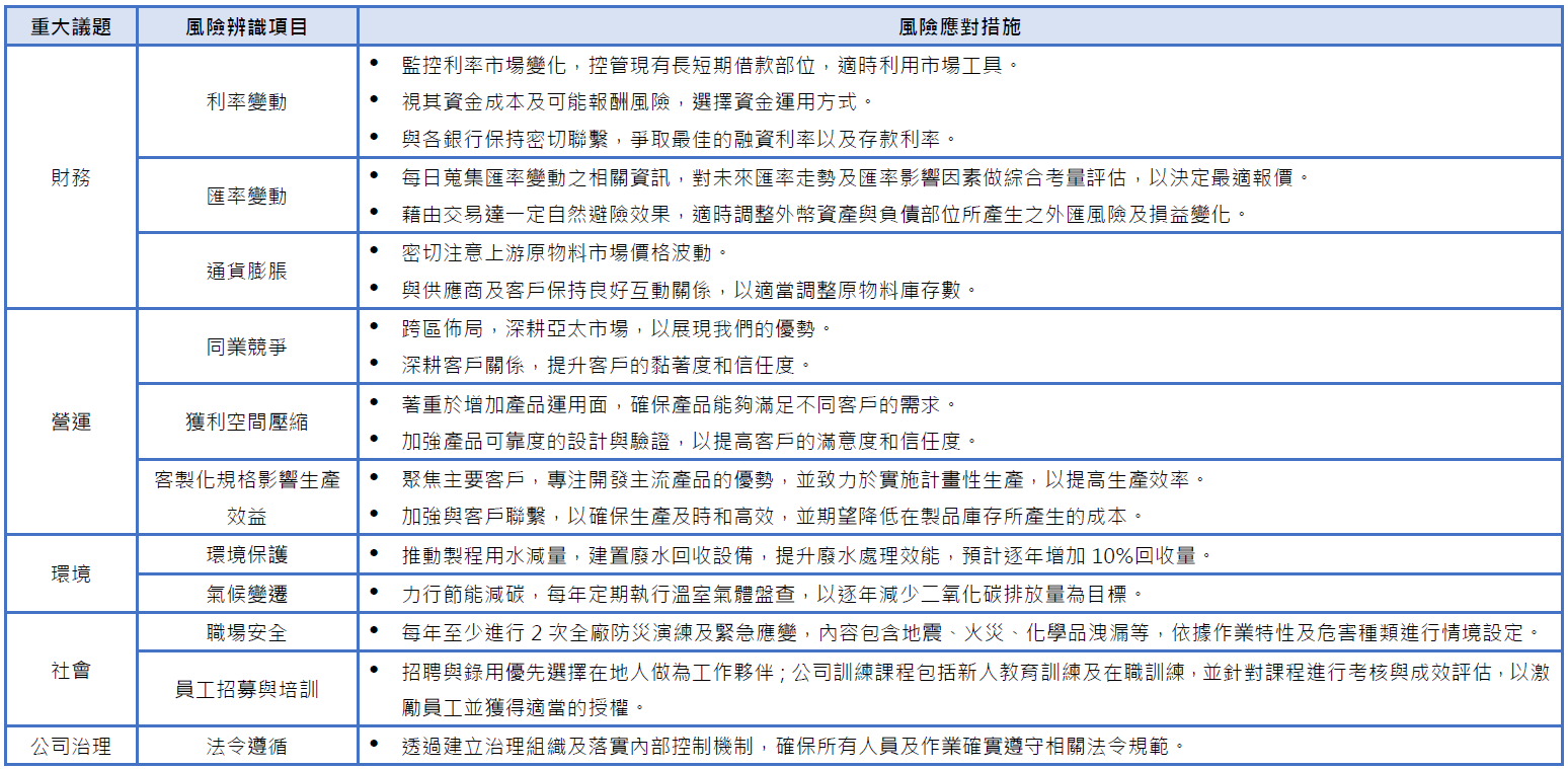 本公司風險管理流程包含風險辨識、風險衡量、風險回應、風險監控及風險管理資訊溝通與處理等要素,除透過跨部門溝通與資料蒐集彙整各項風險可能對本公 司產生的整體影響外,亦將各項風險影響程度與本公司短中長期營運目標相互連 結,以掌握本公司對於風險影響的承受度。 為落實風險管理機制,每年定期展開集團風險評估作業,風險評估作業結果報告每年皆會定期呈報與永續發展委員會(由董事長及 2 位獨立董事組成,最新一次呈報日期為 2024/12/18)、審計委員會(由 3 位獨立董事組成,最新一次呈報日期為 2024/12/18)以及董事會(最新一次呈報日期為 2024/12/19),呈報內容包括彙整當年公司所面臨之各項風險(2024年度所遇風險項目,如:匯率風險、營運成本風險、法規遵循風險、氣候變遷風險等),及風險因應措施與預計改善計畫等,後續於每年進行追蹤,並知會稽核室追蹤結果,由稽核室對於風險管理作業執行風險管理稽核,以確保本公司風險管理有效運作與執行。