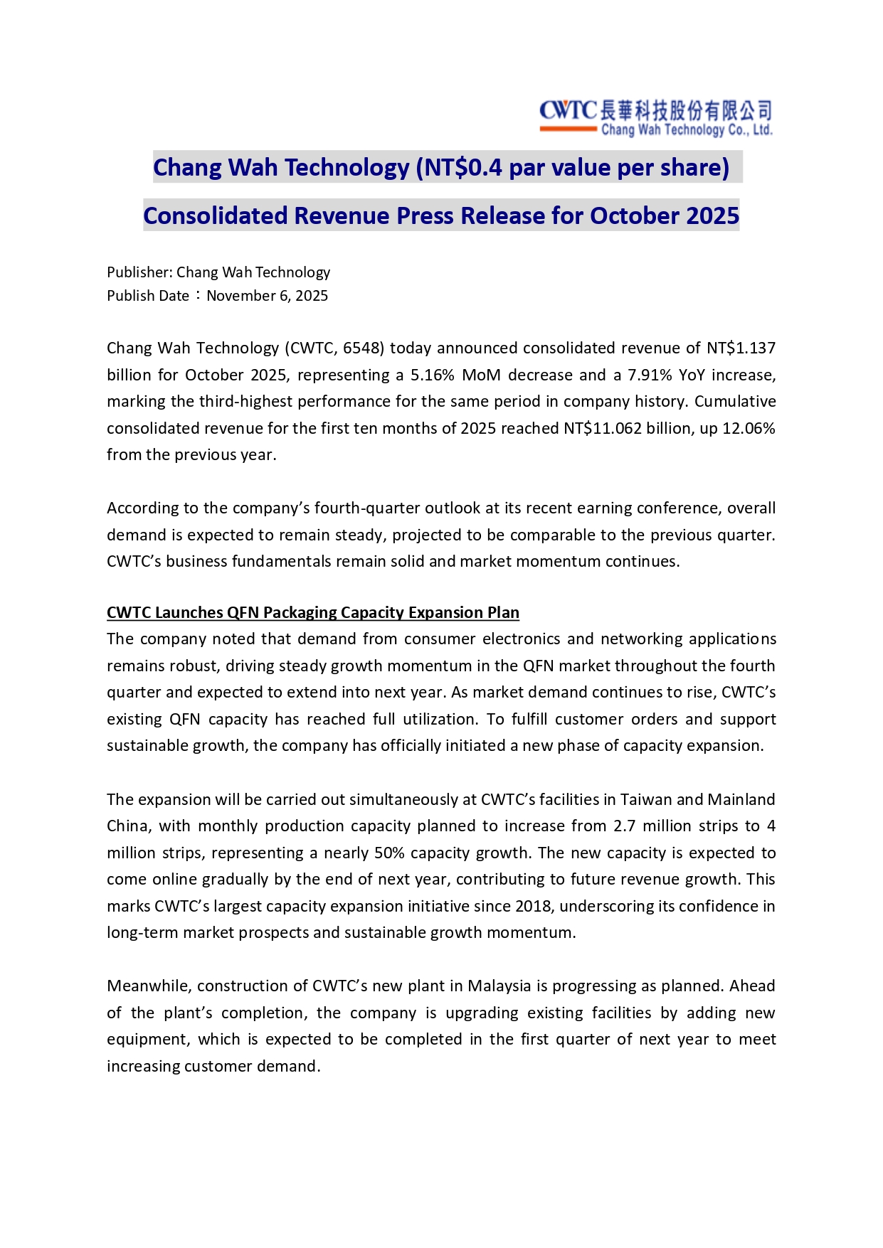 CWTC(6548) Consolidated Revenue Press Release for October 2025