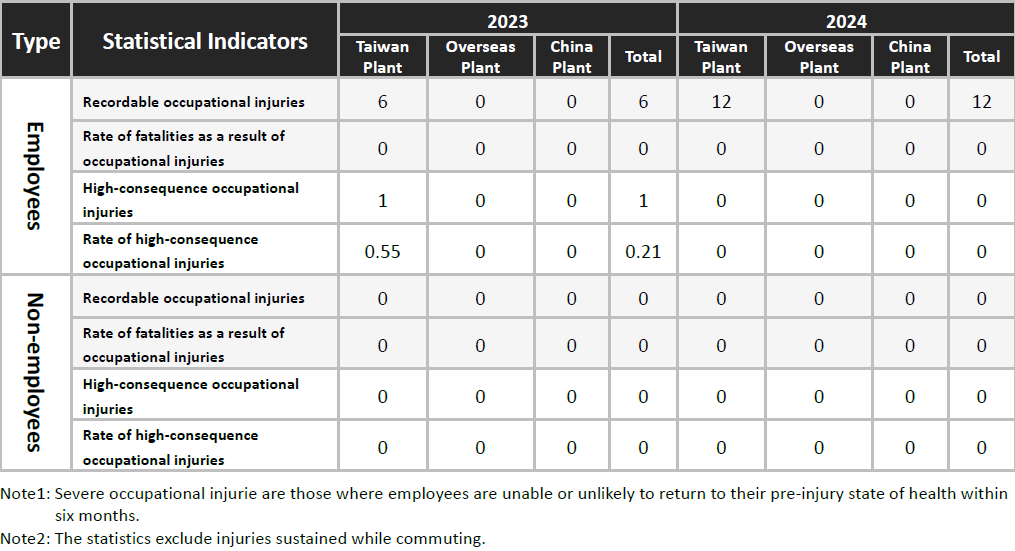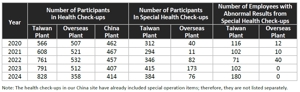 The Company provides health check-ups that exceed regulatory requirements, offering all employees annual health screenings, including general check-ups and special hazard-related assessments, to understand and protect our employees’ health status. Since 2019, the Taiwan plant has also included electrocardiography to assess cardiovascular health and prevent overwork. Health check-up results are managed by risk levels. We track employees in high-risk health groups and provide relevant health education and consultation services to safeguard their health and prevent occupational diseases. In 2024, 180 employees at the Taiwan plant were categorized for Level 2 to Level 3 management based on their special health check results. They were interviewed and monitored by nurses and on-site physicians, with results from follow-up doctor appointments uploaded to the official system as required by law. No occupational disease cases were diagnosed at any domestic or overseas plants in 2024.