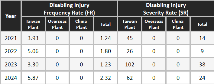 Occupational injury statistics are calculated based on the definitions provided by the “Occupational Safety and Health Act” and the key disabling injury indicators published by the Global Reporting Initiative (GRI), focusing on the frequency rate (FR) and severity rate (SR) of disabling injuries.