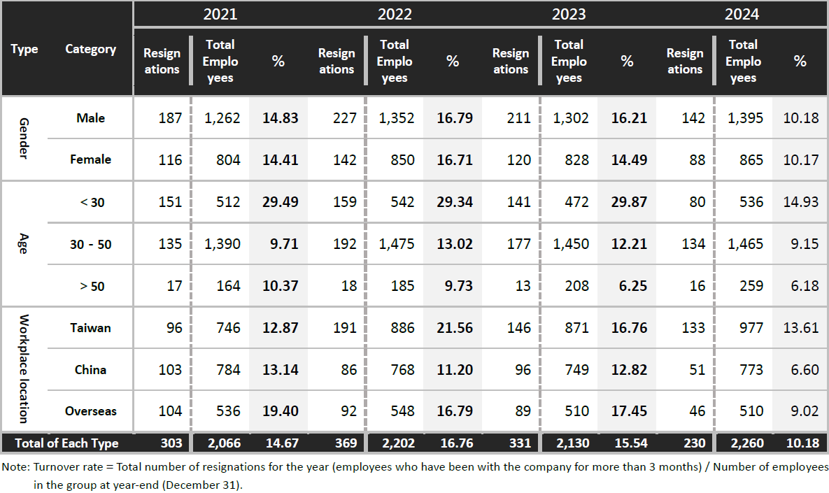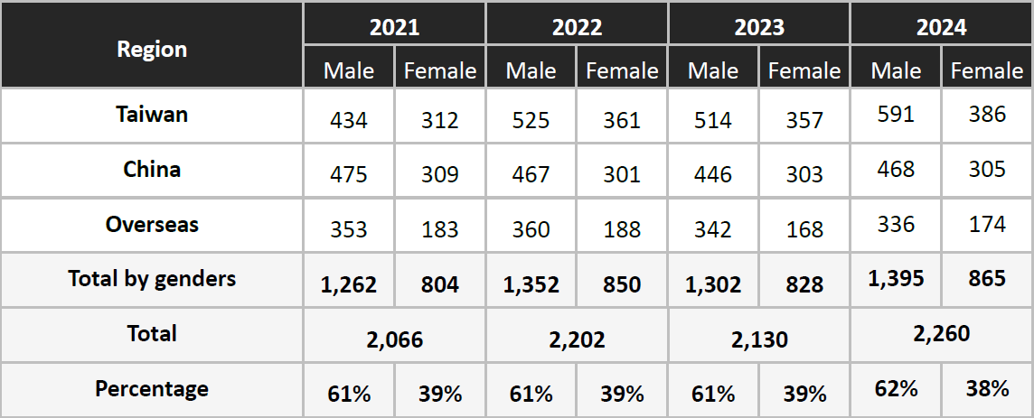 As of the end of December 2024, CWTC Group employed a total of 2,260 staff (97.16%), with 66 workers (2.84%) hired through external contractors for tasks such as site cleaning, security and gardening. Among the total employees, 62% are male and 38% are female, with the majority (65%) aged between 30 and 50. There were 230 resignations, a 31% decrease compared to 2023. The number of employees with disabilities is 10, and the number of minority group members is 7, representing approximately 0.44% and 0.31%, respectively.