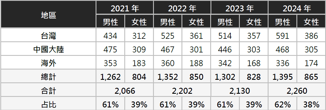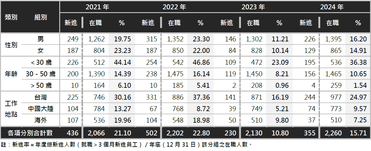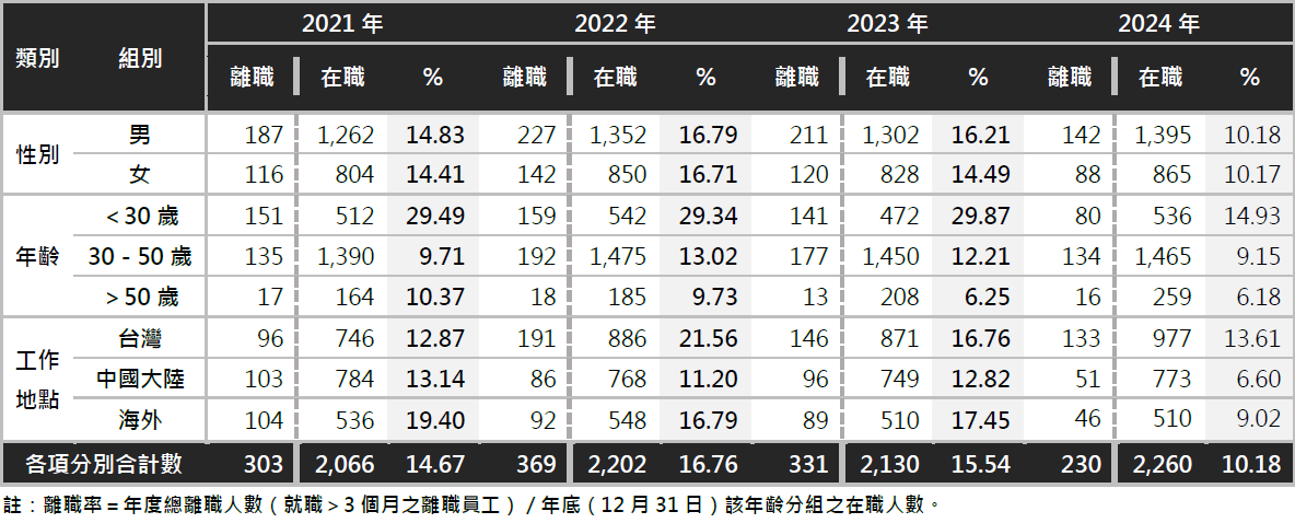 截至2024年12月底止,长华科技集团总员工人数2,260人(97.16%),非员工之工作者66人(2.84%),非员工之工作者系由公司委外厂商雇用,其主要工作内容为厂区清洁、驻卫警及园丁。总员工人数中男性占62%、女性占38%;年龄层主要集中在30-50岁,约占65%。离职员工共230位,较2023年大幅减少31%;在职之身心障碍员工人数10人,少数族群人数7人,分别占约0.44%及0.31%。另为补足当地劳力不足之人力需求,部分同仁为来自海外之外籍员工,需持工作签证工作,2024年需申请工作签证之员工人数233人,占10.31%。我们透过合法聘用与合约透明化,所有需签证之外籍员工均由经合法仲介引介,签署之聘用合约均以母语提供,并详细载明工时、薪资、住宿等条件,以确保双方权益。